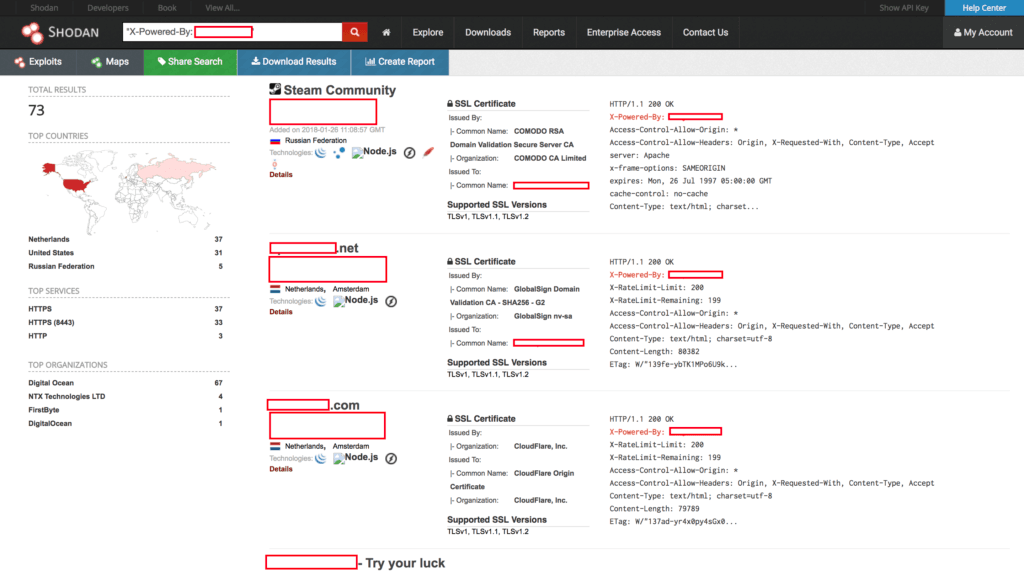 There were almost 300 results for the specific header that were all tied to CSGO gambling or trading websites. This wasn't a true count of how many of the websites existed as many were websites like "htmlstat.domains" or "ipaddress.com", but it was definitely interesting seeing how this one unique string tied them all together.